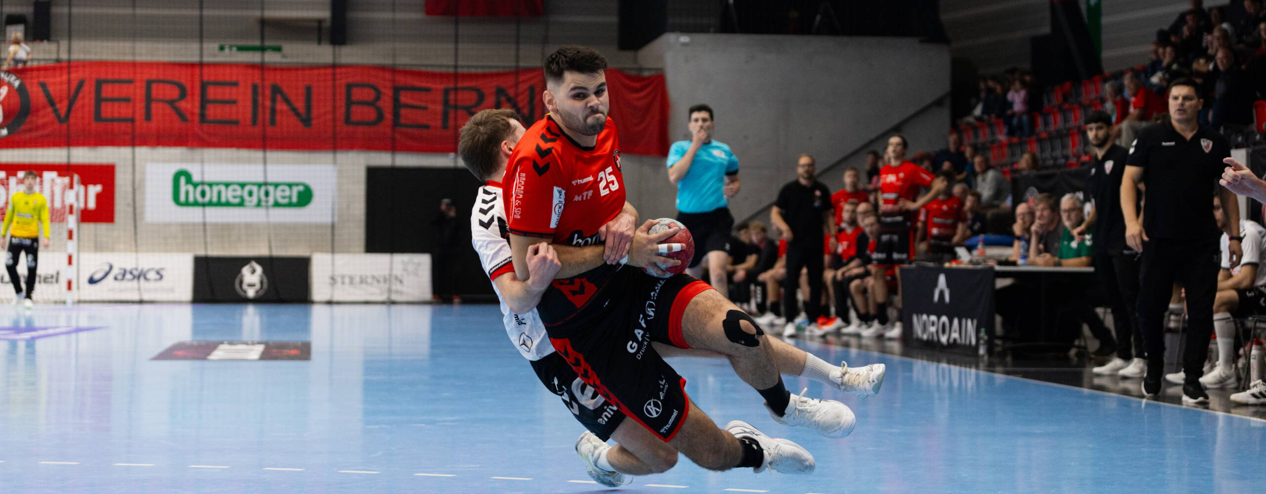 Der BSV erwischte den besseren Start: Torhüter Seravalli eröffnete das Spiel mit einer Parade und Michael Kusio erzielte das frühe 1:0. Kurz darauf traf Levin Wanner zum 2:0. Zwei kleine Unachtsamkeiten ermöglichten Suhr zwar den Ausgleich, doch danach übernahmen die Stadtberner endgültig das Kommando. Kusio sorgte mit einem schönen Drehwurf für das 3:2 und erhöhte wenig später erneut. Nyström traf nach herrlichem Zuspiel von Kusio und Wanner verwandelte vom Siebenmeterpunkt sicher. Die Stadtberner zogen Tor um Tor davon – Strahm, Kalt und erneut Kusio erhöhten bis zur Pause auf 20:11. Seravalli glänzte mit mehreren Paraden, unter anderem bei einem Penalty von Sarlos.